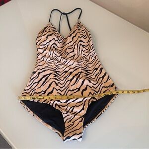 VENUS one-piece swimsuit in a bold tiger-inspired animal print with a peachy nude base and black wavy striping, featuring slim strappy back detailing, flattering scoop neckline, high-cut leg openings, and a sleek sculpting silhouette designed to elongate and contour. Fully lined with smooth stretch fabric (80% nylon, 20% spandex) offering comfort, flexibility, and supportive wear for beach days, pool lounging, resort vacations, cruises, and summer travel. Statement animal print swim with a confident, modern edge that performs well for coastal, resort, Euro-summer, and elevated poolside styling. Size 8. Highly searched swim brand with consistent sell-through on Poshmark. Save this item to receive private offers.