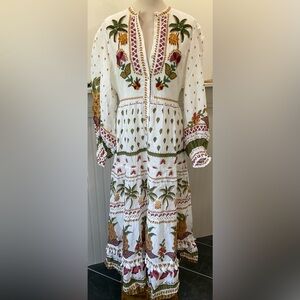 Beautiful Democracy women’s blouse in size XL. Features a muted blue, gray, and green floral print with a flattering v-neckline and long sleeves with light ruching at the shoulders. Lightweight and soft with a slight stretch for comfort. High-low hem for an easy, flattering fit.