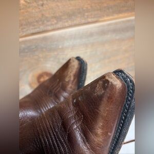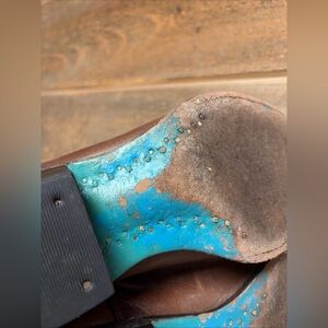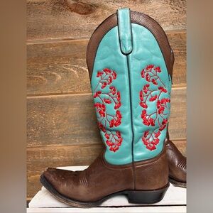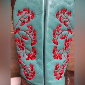 size 8.5. nice blue teal color with red embroidery. pre-owned and definitely well worn and loved. please see all photos for condition. there are scuffs/marks/scrapes etc from wear. note bottom of boots for wear. please let me know if you have any questions or need any additional photos!