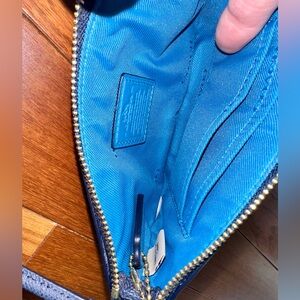 Elegant Coach wristlet in dual shades of blue. Features a detachable strap and front pocket.