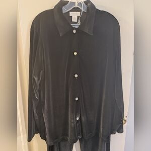 Elegant vintage black velvet blouse with matching pants. Features button down blouse and slip on elastic pants with a tie belt. Perfect for formal occasions or dress it down for leisure wear. The blouse is XL and the pants are L. One of the belt loops is not attached to pants on one side.