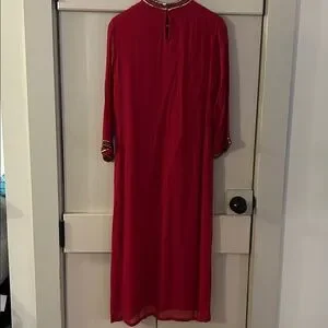 This chic long sleeve red dress pantsuit features elegant embellishments, perfect for making a statement at any event. There are slits on both sides of the dress. The length of dress is 46.5 inches. The slits are 27 inches. The pants are plain with no embellishments.
