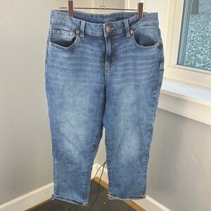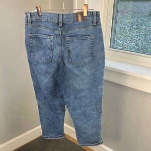 Casual and comfortable boyfriend jeans. Has stretch, machine washable cotton spandex blend. Approximate Measurements: waist 16 inches laid flat, rise, 10 inches, inseam 22 inches.