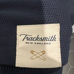 Breathable navy mesh running tank top. Features Tracksmith logo patch.