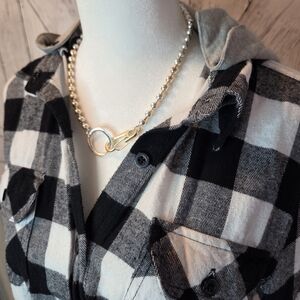 Stylish plaid button down shirt in classic black and white. Perfect for casual outings or a chic office look. Removable hood. Fits more like a M