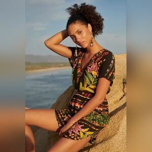 Farm Rio Nieves Floral Black Coverup Tunic Dress. Small. Colorful Viscose