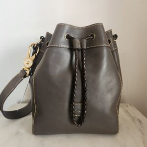 Brand new, very rare Dooney and Bourke drawstring Hattie Florentine Leather bucket bag and matching wallet in Light Taupe. I collect and love this particular style of bag, bought it in most every color and snagged the matching wallet, which is really hard to come by! It's been stored properly, never used and from a non-smoking pet free environment. Measures approximately 11 inches high, 6 inches deep and 9.5 across. It's the perfect neutral bag that's good all year round. I will ship promptly and pack extremely well. ๐
