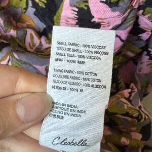 Cleobella 'Stevie' long sleeve mini dress in Tapestry abstract floral print in soft pink, olive, and lavender tones. Deep V neckline, ruffle accents on waist and trim, and gently draped skirt for a flattering, feminine silhouette. Fully lined with a zip at back. Size Medium - 19" pit to pit; 16" waist; 34" length.