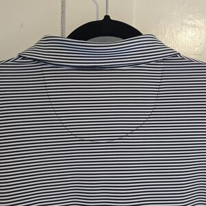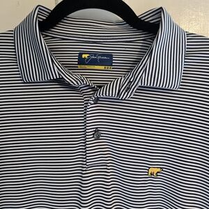 The Jack Nicklaus Polo Shirt in Navy Blue with White Stripes is a stylish men's golf shirt designed for comfort and performance on the course. This short sleeve polo features a button closure and collared neckline, making it perfect for both casual and activewear occasions. The classic striped pattern and Golden Bear logo add a touch of sporty sophistication, while the regular fit ensures a comfortable and flattering silhouette. If you're hitting the links, this high-quality polo shirt is a must-have addition to any golfer's wardrobe. Size Medium. This shirt is like new without tags and no imperfections noted. Please see pictures for reference. Thanks for looking!