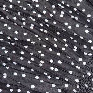 Black pleated midi skirt with a soft drape and classic white polka dot print. Lightweight polyester with movement and flow. Easy pull-on style. Works styled coquette, office siren, or minimalist Y2K.