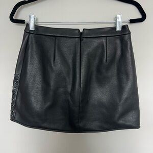 Stylish black leather mini skirt with eyelet accents. Ideal for a bold fashion statement.