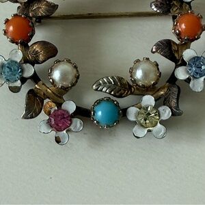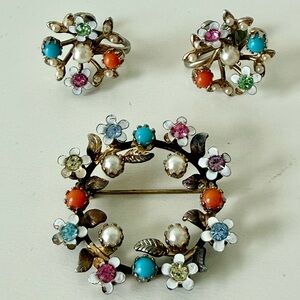 Add a touch of mid-century charm to your collection with this beautiful vintage fashion jewelry set. This coordinated set features a circular wreath-style brooch and matching clip-on earrings, designed with a vibrant "garden party" aesthetic typical of the late 1950s or early 1960s.