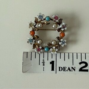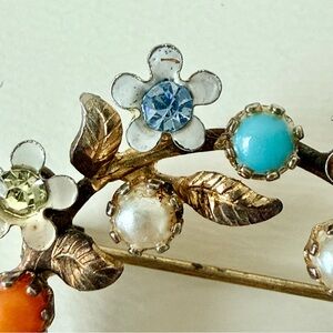 Good vintage condition. There is some light, age-appropriate wear to the enamel petals and a lovely patina on the gold-tone metal, which adds to its authentic vintage character. All stones appear intact and secure.
