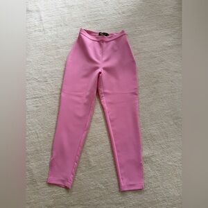 Stylish pink blazer with matching pants. Features unique bow details on the sleeves.