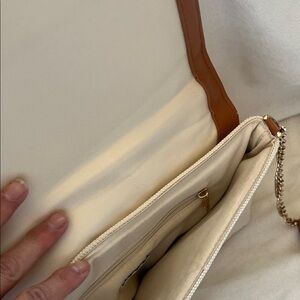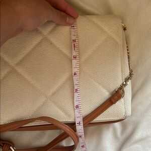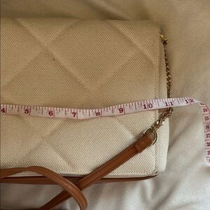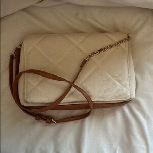 Stylish cream crossbody bag. Features a tan strap and quilted design. Perfect for any outfit.