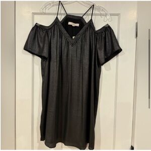 Loft NEW with tags cold shoulder dress in metallic shimmer gunmetal grey, racer back, flowy, pit to pit measuring about 20 3/4” when laying flat, V front in a womens size medium petite.