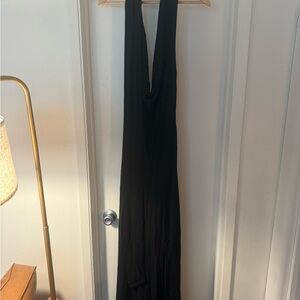 Stunning black, backless gown by Michael Costello from Revolve. Features a chic halter neck design. Heavy weight, high quality material that is super flattering. Size large and would fit 8/10/12. Very long !! Worn once to an event but was professionally cleaned since. In good shape and still has tag that was accidentally left on.