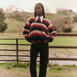 THE GREAT. Striped Crew Neck Sweater in Navy Red Green Cream