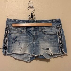 Trendy light blue jean shorts with lace-up sides. Distressed details for a casual look.