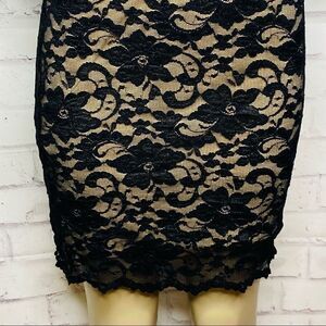 An intricate floral lace overlay contrasts beautifully with the lighter-colored lining of a short boatneck dress finished with sheer lace sleeves. Slips on over head. Fully lined.smoke free home. M=8/10