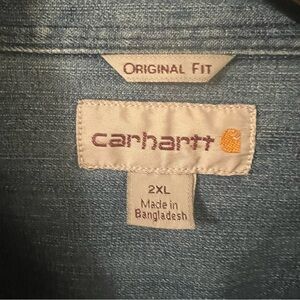 Men’s 2XL Carhartt button down denim shirt. Features dual chest pockets with button closure. 100% cotton midweight denim. Oversized for layering