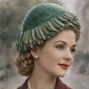 The hat features a soft green faux fur felt body made by Grenadier of Austria, a respected European manufacturer whose felt forms were imported for luxury American milliners. Around the crown is an elaborate layered trim of translucent plastic feather shapes, hand-attached to create movement and depth. This mix of traditional felt with modern materials is a hallmark of early 1960s design.