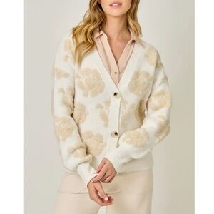 Cozy cardigan with floral pattern. Features button closure. Soft and stylish.