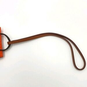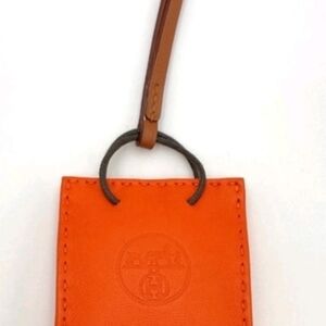An authentic Hermès leather mini pouch bag charm, crafted in the house’s iconic Hermès orange with hand-stitched edges, embossed branding, and a leather strap designed to clip onto handbags, totes, or keys.