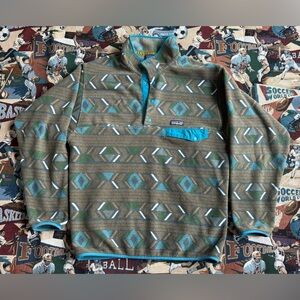 Cozy Patagonia Synchilla fleece. Features blue trim and green geometric accents.