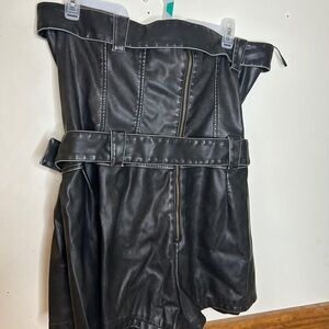 Chic black strapless mini romper featuring a stylish belt. Perfect for a night out.