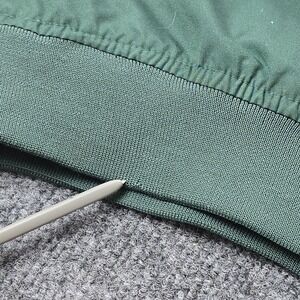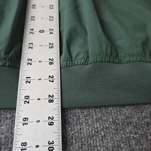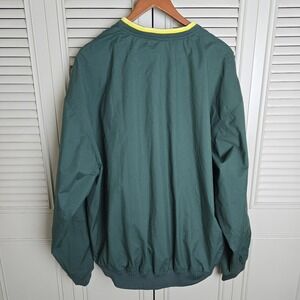 Nike Team Oregon Ducks pullover windbreaker in dark green with yellow/white V-neck trim and embroidered yellow Nike swoosh above the "OREGON" front graphic. Pullover style with side-zip entry/vent on one side, front hand pockets, rib-knit cuffs and rib-knit hem. Tag shows size XXL, 100% polyester, made in Indonesia (RN 56323 / CA 05553). Measurements: approx 29" pit to pit, 28" length. Condition: good overall; one tiny dot on the back of the upper arm and a very minor snag at the bottom hem (see photos for details).