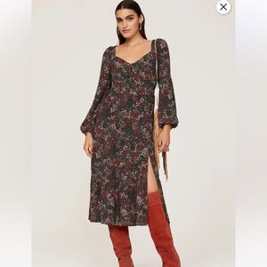 Billowy long sleeves and a tie at the sweetheart neckline are just some of the darling details that elevate this floral-print midi dress.