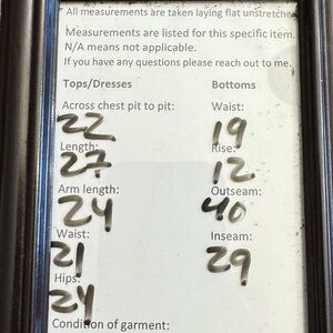 Pant: Waist 19", rise 12'', Inseam 29", outseam 40”
