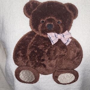 Off White Knit Sweater Showing TEDDY BEAR with Bow design.