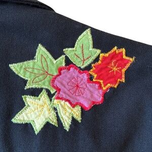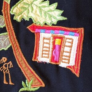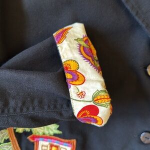 Hearts of Palm Black Embroidered Button Front Collared Jacket Blazer. Tropical Floral embroidery front and back, with vibrant lining and roll-up sleeves. Palm tree embossed buttons. 100% cotton. Machine wash. Appliqué design works for all seasons. Made in India.