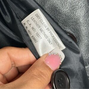 Chic black leather jacket by Bagatelle. Features a sleek design with a belted waist. Ideal for stylish outings. Button down with pockets. Longline, I’m 5 foot and it hits me at the knees. Shoulder pads