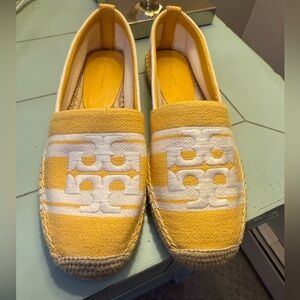 Stylish espadrilles with a vibrant yellow and white design. Features classic Tory Burch logo. Comfortable and chic for any occasion.