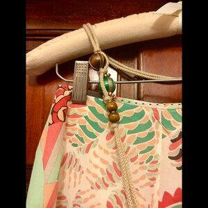 Bold, artistic statement piece featuring a vibrant abstract print in coral, seafoam green, peach, and cream that blends geometric shapes with boho florals. Pleated A-line silhouette delivers an airy, yet structured drape. Woven rope waist tie, accented with polished wooden beads, adds earthy artisanal texture.