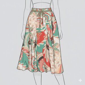Coral, Green, Peach, Cream Floral Boho Elie Tahari Tropical Midi Skirt (US 2)