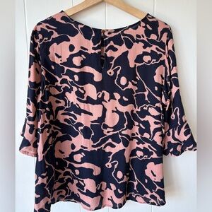 This gorgeous Zest blouse features a sophisticated pink and navy abstract camo-inspired print. Made from 100% viscose, the fabric has a lightweight, silky drape that’s perfect for all-day comfort. The feminine 3/4 length ruffle sleeves add a touch of flair to a classic silhouette.
