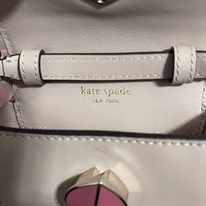 Elegant Kate Spade crossbody in blush. Features a gold chain strap and signature logo detail.