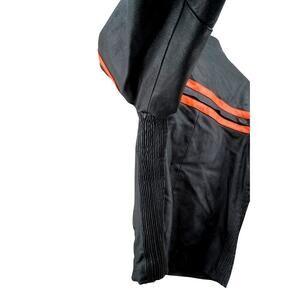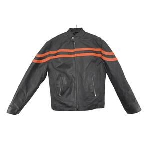 Heavyweight genuine leather biker jacket featuring bright orange racing stripes across the chest and down the sleeves. Full zip front, zip cuffs, snap collar, and two zippered pockets. Classic moto look with bold contrast striping.