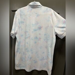 Soft, lightweight polo featuring a light blue and pink pastel pattern throughout. Classic collared neckline with button placket and short sleeves. Comfortable stretch fabric makes it perfect for golf, casual wear, or everyday style.