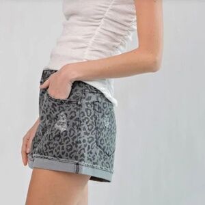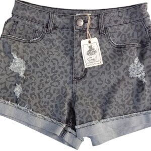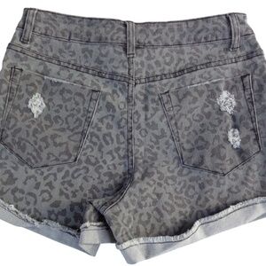 Washed denim animal print shorts with distressing.