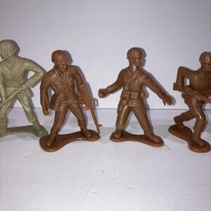 The product is a set of vintage 1970's large 4-5" army men action figures by Greenbrier International style . These plastic infantry soldiers are a nostalgic collectible from the era, representing a piece of toy history. With their classic design and retro charm, these toy soldiers are sure to be a hit with collectors or enthusiasts of vintage toys.