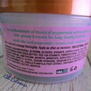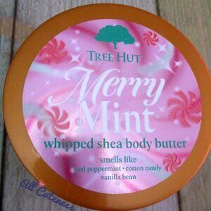 Tree Hut Merry Mint whipped shea body butter. A lightweight, non-greasy formula for long-lasting hydration. Smells like iced peppermint, cotton candy, vanilla bean.