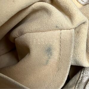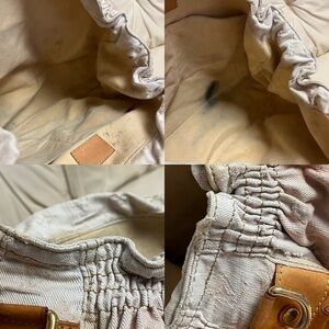 VINTAGE CONDITION, HASN'T BEEN USED IN A FEW YEARS, MUSTY SMELL from being stored, Vachetta leather is darkened with water marks, scratches on vachetta leather, vachetta buckle strap is hard/stiff and wrinkled, BROWN STAINS/MARKS on front flap, brown dirt marks on outside, color coming off metal pieces, dusty from being stored, scratches on metal pieces, dirt marks on the inside of bag, scratches on metal pieces, color coming off metal pieces, FRAYING AROUND EDGES of top pf bag, FRAYED on back of flap, lighter white mark going horizontally across back of bag under leather strip, leather backing for back vachetta strip cracking on bottom side