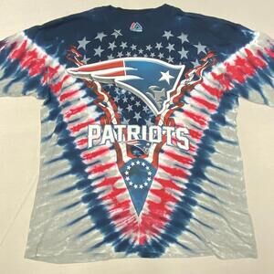 Vintage New England Patriots tie-dye t-shirt featuring a bold patriotic design with red, white, and blue colors.