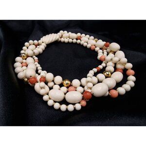 This necklace features a multi-strand composition of creamy ivory-toned beads, interspersed with warm coral-colored accents and gold-tone spacer beads. The graduated bead sizes and rhythmic repetition create a collar-like silhouette, echoing: