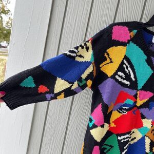 abstract art sweater, colorful knit, 80s style, maximalist, gallery girl, funky retro, statement sweater, hand knit, Hong Kong knit, winter layering